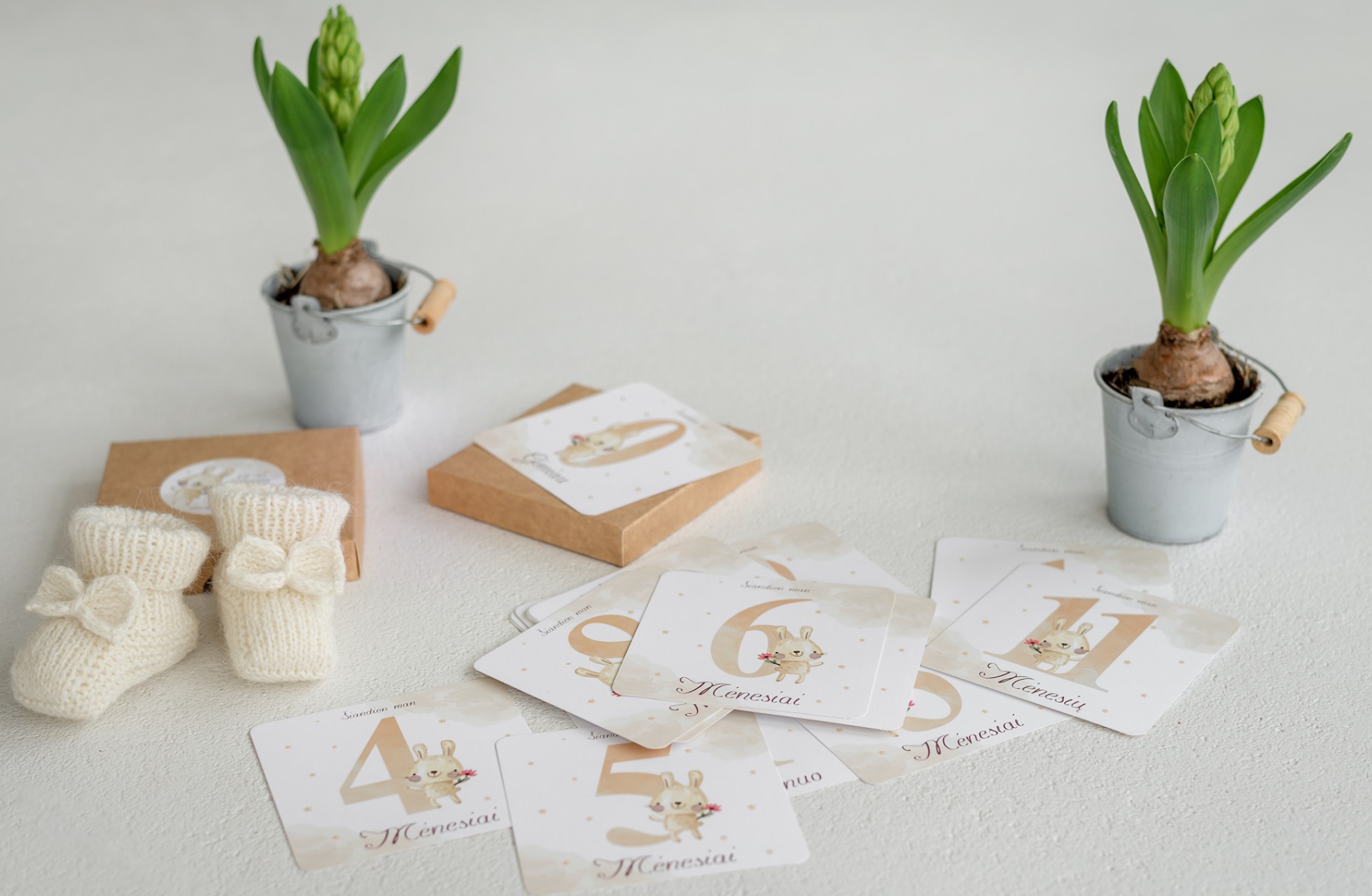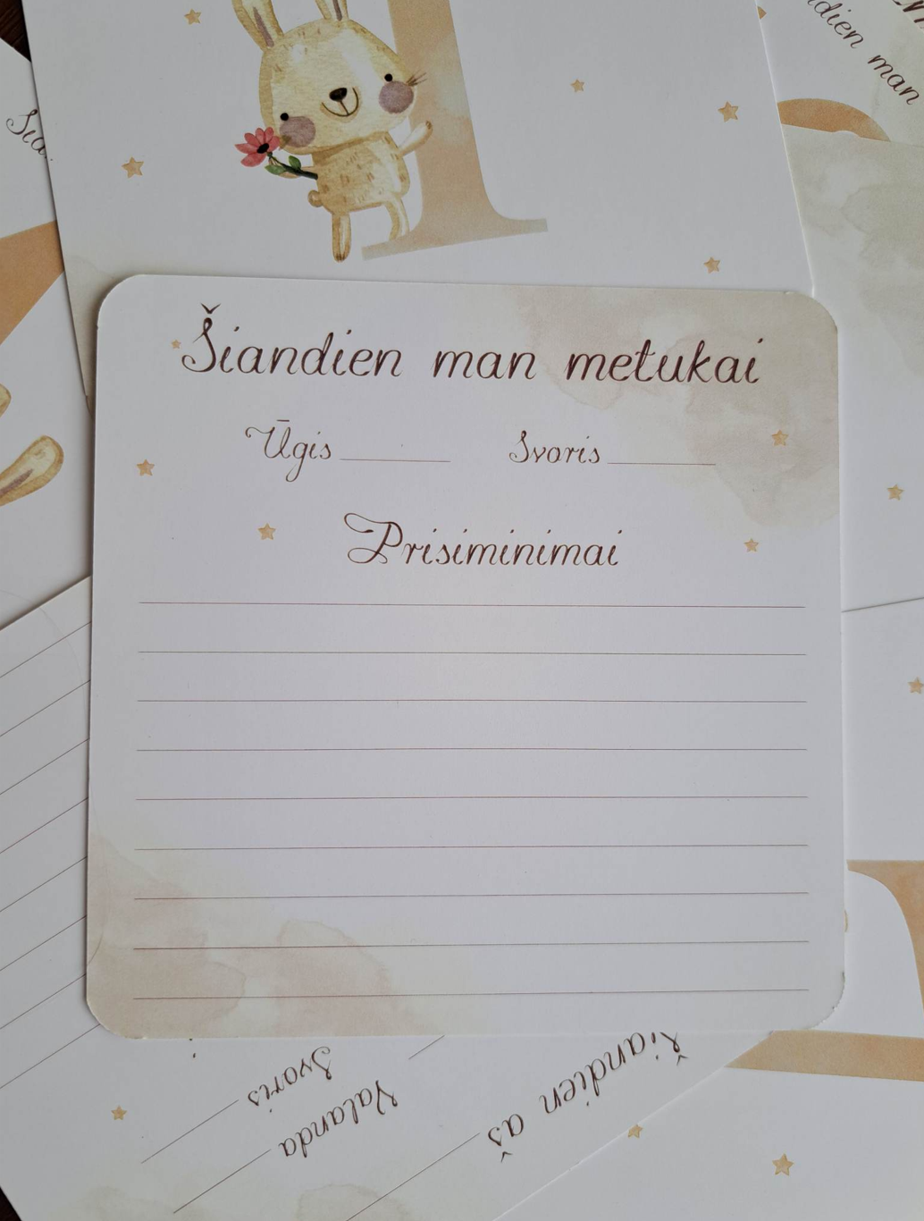 Lietuviškos kūdikio mėnesių kortelės. Dvipusės, su kortelės nugarėlėje skirta vieta užrašyti prisiminimus ir svarbiausių akimirkų detales.
